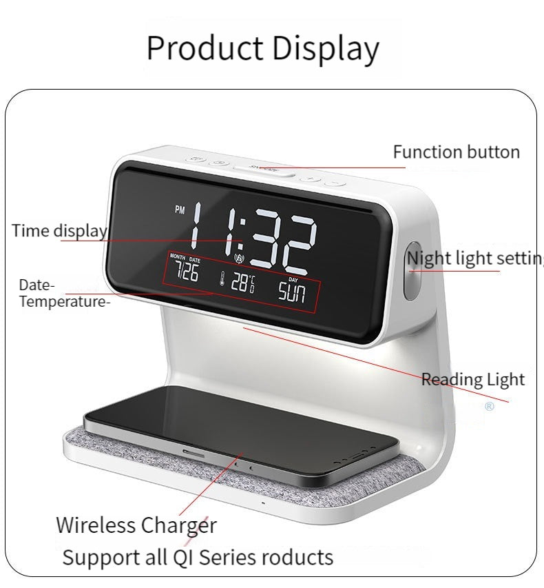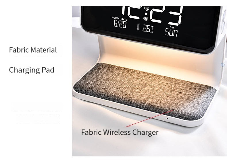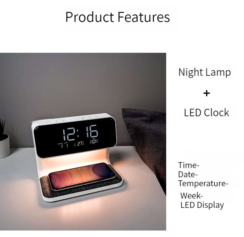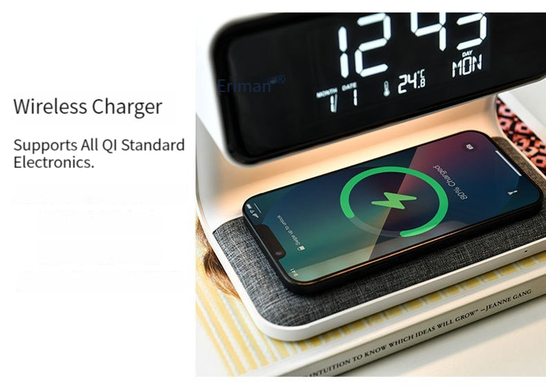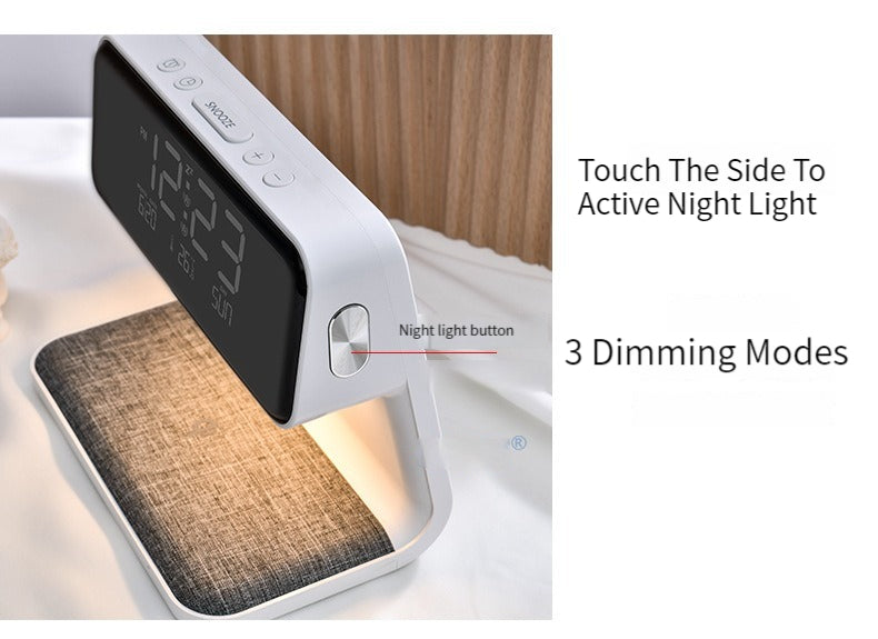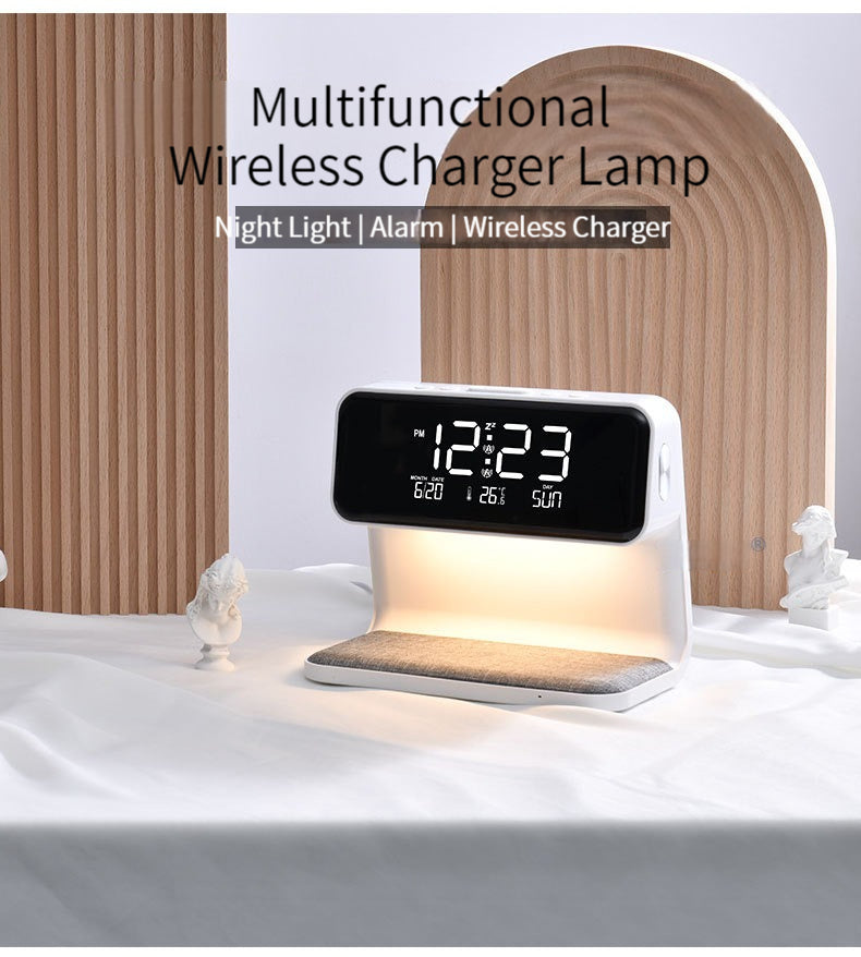 Functions: Bedside night light, wireless charging for phones, alarm clock